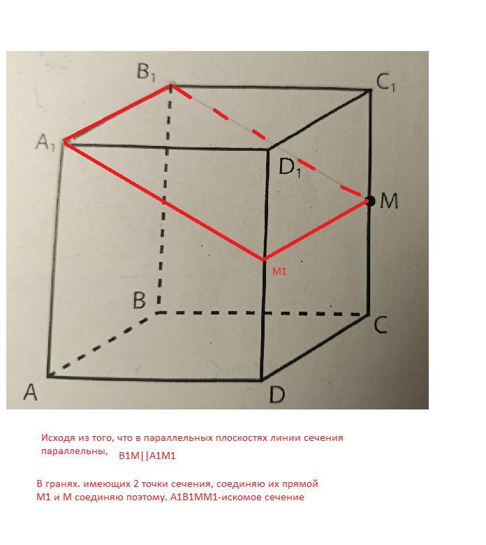 Помогите, пожалуйста, с сечением куба AA1BB1CC1DD1. Сечение проходит через ребро A1B1 и через середину ребра CC1