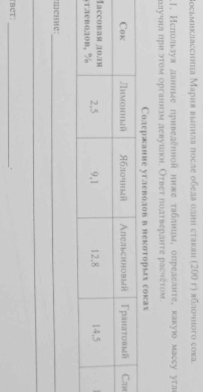 Восьмиклассница Мария выпила после обеда один стакан (200 г) яблочного сока.