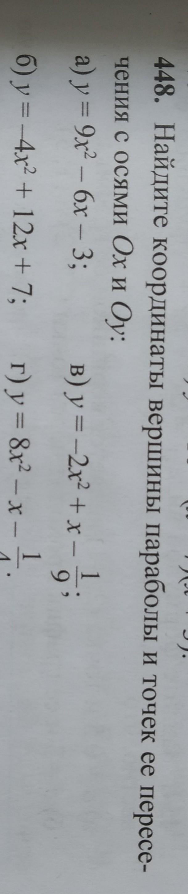 a); ; y=9x^2-6x-3\\x(versh)=-frac{b}{2a}=-frac{-6}{18}=frac{1}{3}\\y(vers)=y(frac{1}{3})=9cdotfrac{1}{9}-6cdot frac{1}{3}-3=1-2-3=-4\\V(frac{1}{3}, ;, -4)\\\OX:; ; y=0; ,; ; 9x^2-6x-3=0; ; ,; ; D/4=3^2+9cdot 3=36\\x_1=frac{3-6}{9}=-frac{1}{3}; ; ,; ; x_2=frac{3+6}{9}=1\\A(-frac{1}{3}, ;, 0); ; ,; ; B(, 1, ;, 0, )\\\OY:; ; x=0; ; ,; ; y=-3; ; ,; ; C(0,-3)