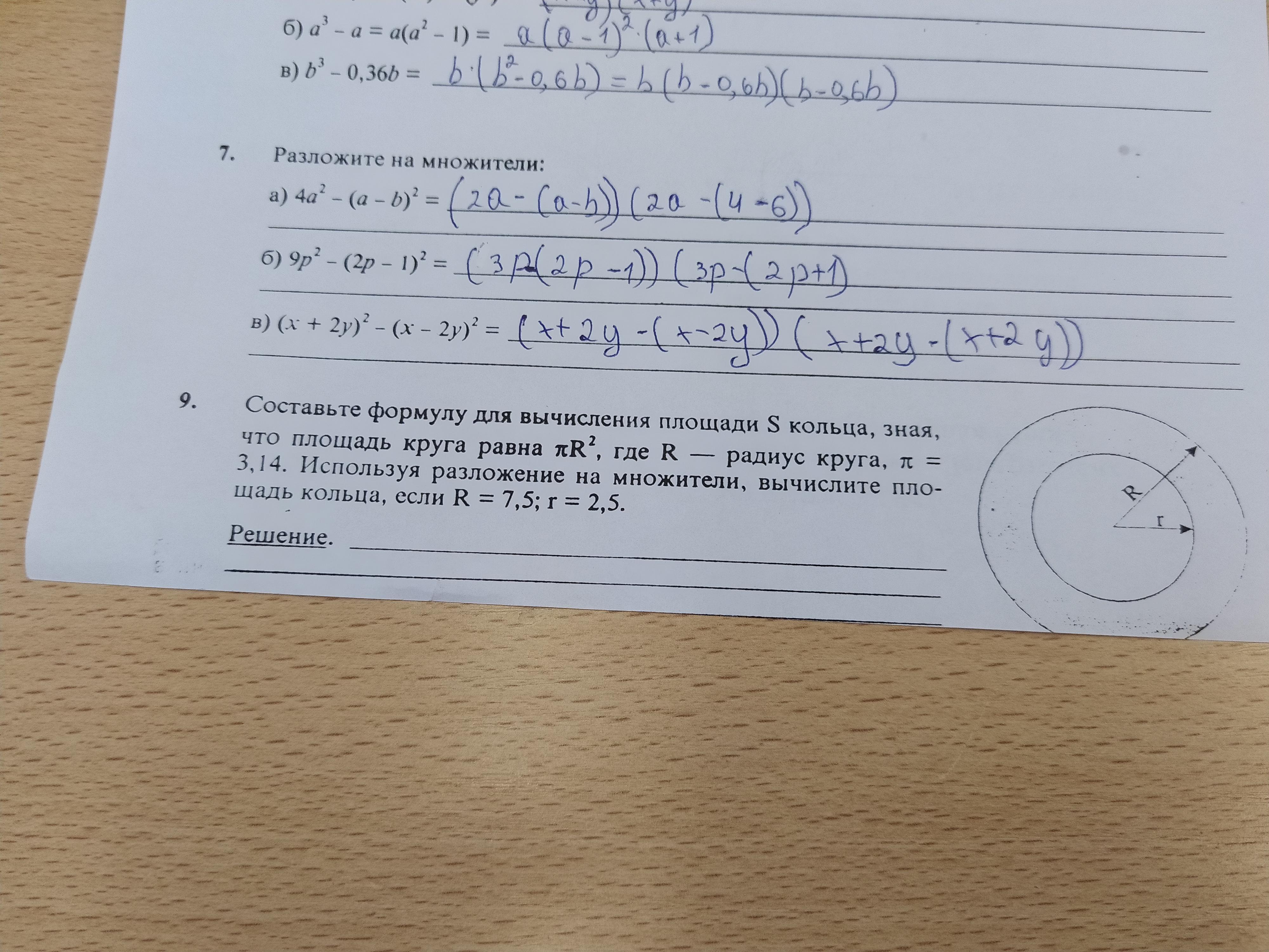 S = πR² - πr² =π(R² - r²) = π(R - r)(R + r) = 3,14 * (7,5 - 2,5)(7,5 + 2,5) ≈