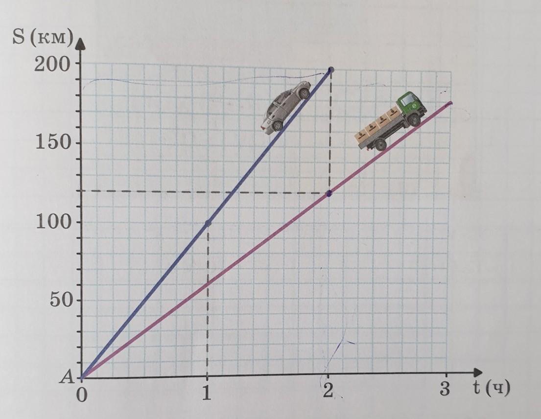 Прочитай условия соответствует ли оно графику? Измени условие задачи согласно графику. Ответьте на вопрос задачи. Из города одновременно в одном направлении выезжает легковая и грузовая машины. Грузовая машина едет со скоростью 60 км/ ч и легковая со скоростью 120 км/ч На каком расстоянии друг от друга окажутся машины через 2 часа?
