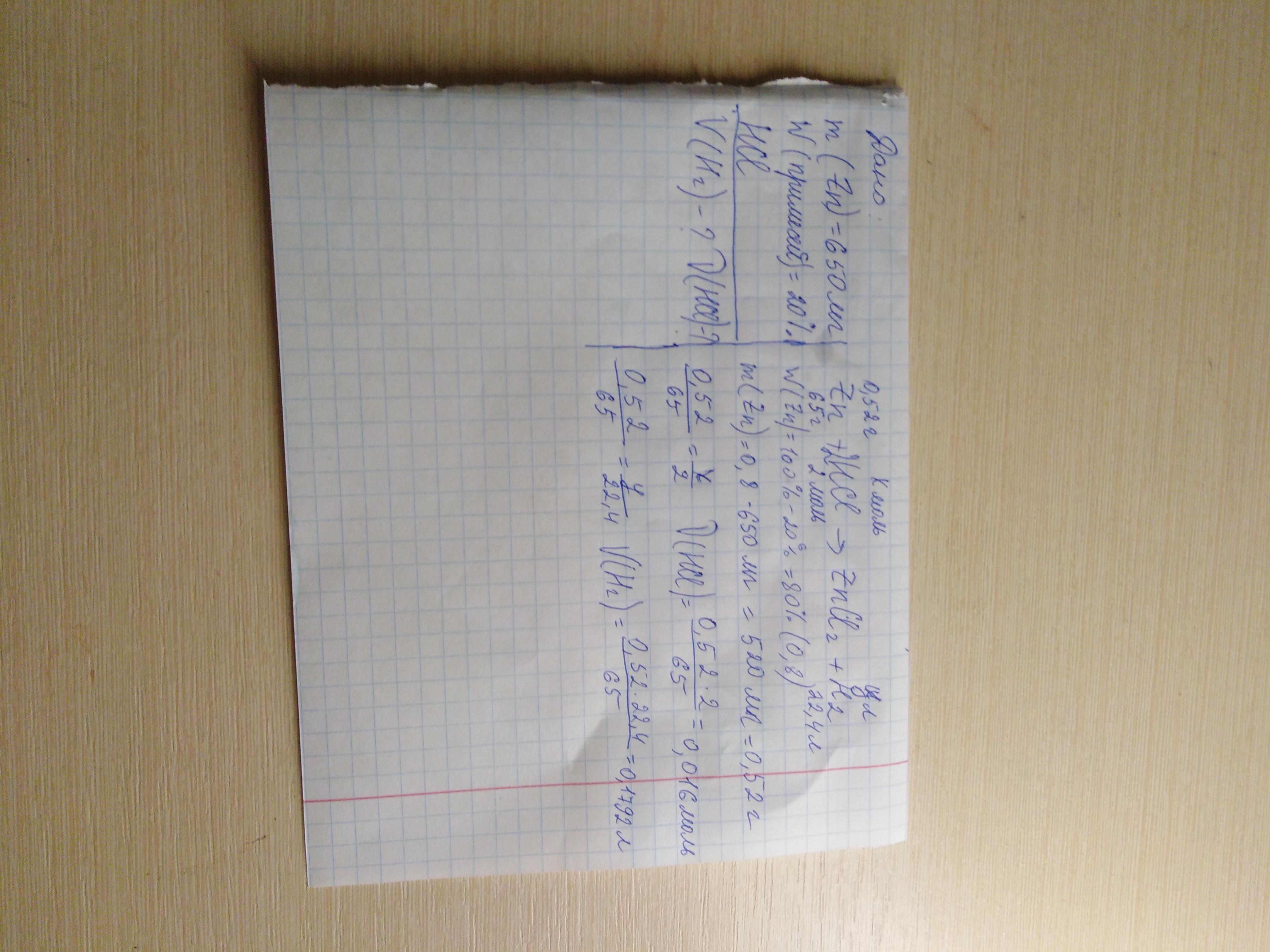какой объем водорода образуется при взаимодействии 650 мг цинка содержащего 20 процентов примесей с необходимым количеством соляной кислоты каково это количество кислоты?