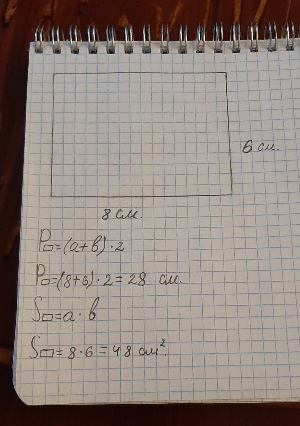 нарисуйте прямоугольник длина которого 8см ,а ширина стороны 6 см . Найдите периметр и площадь прямоугольника