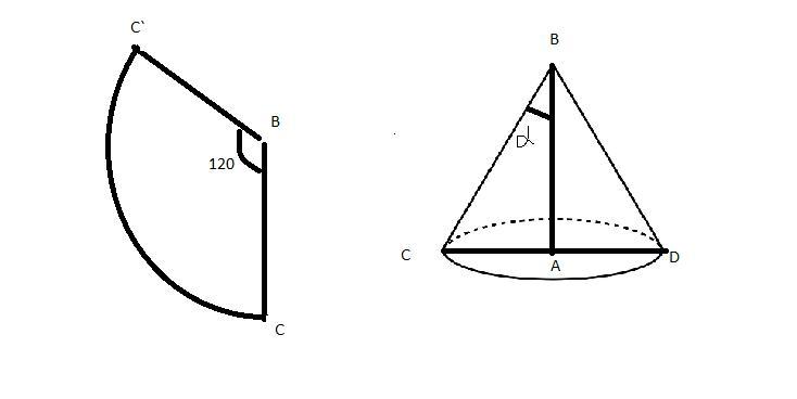Используя данный нам ∠φ (угол развертки боковой поверхности, равен 120°) найдем sinα