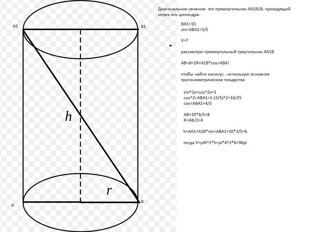 3. Диагональ осевого сечения цилиндра равна 10 см и образует с основанием угол, синус которого равен 3/5. Найдите объем цилиндра.