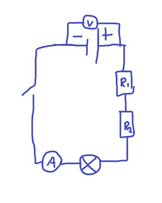 начертите схему электрической цепи, включающую в себя: источник тока-батарейку, два резистора, соединенные последовательно. электрическую лампочку, включенную последовательно с резисторами, амперметр, измеряющий силу тока в неразветвленной части цепи, и вольтметр, измеряющий напряжение на зажимах источника тока.