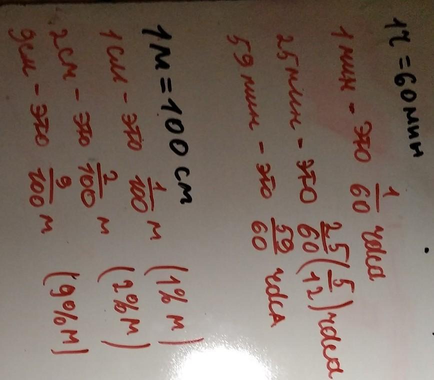 А)Запиши с помощью дроби, какую часть составляют 1минута,25минут,59минут?В)Запиши в виде процентов, запиши, какую часть метра составляют 1см,2см,9см?