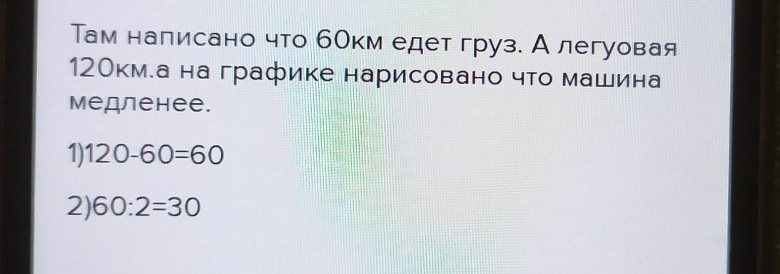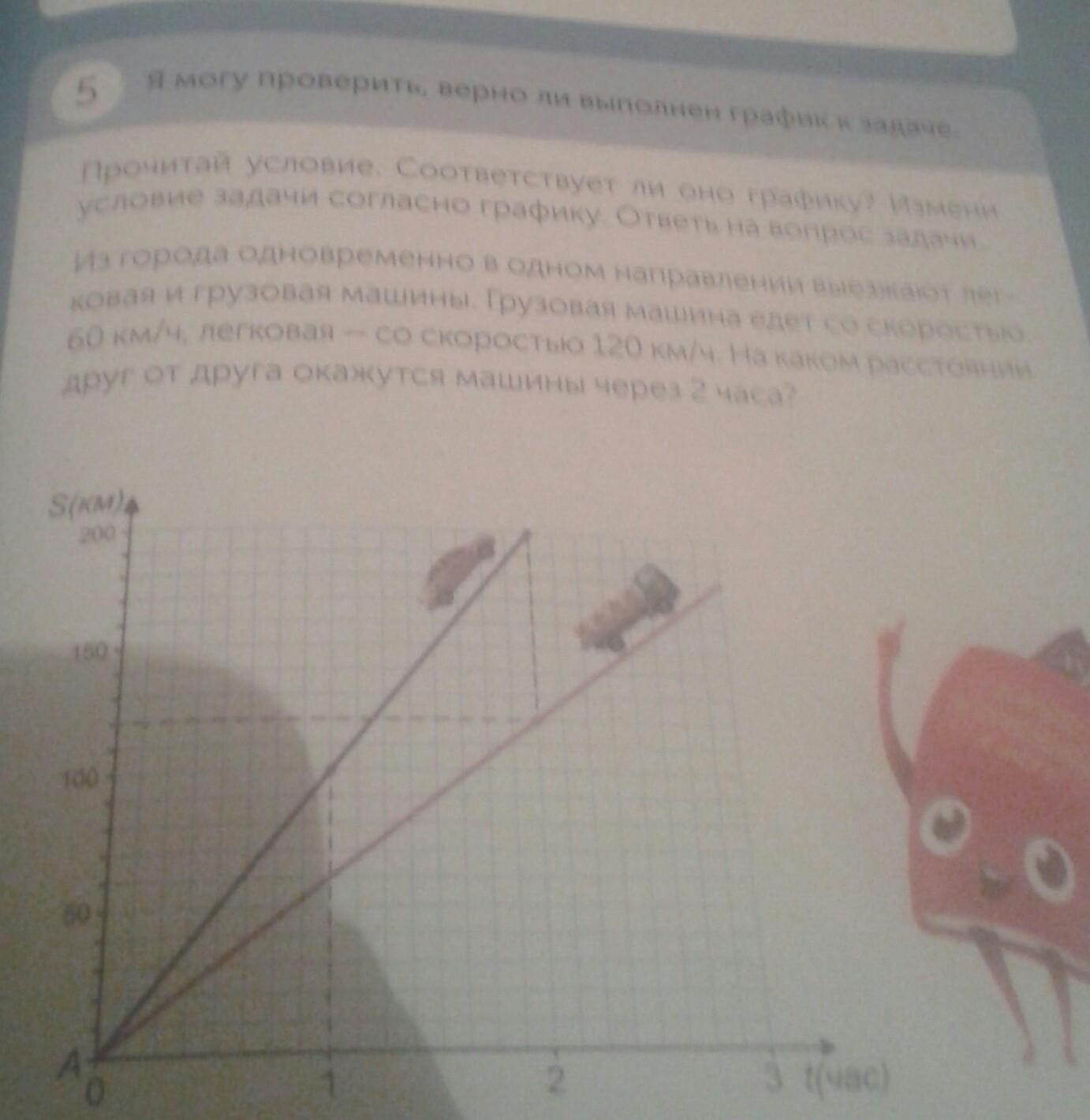 Прочитай условия. Соответствует ли оно графику?Измени условия задачи согласно графику.Ответь на вопрос задачи. Из города одновременно в одном направлении выезжают легковая и грузовая машины.Грузовая машина едет со скорость-60км/ч,легковая - со скоростью 120 км/ч.На каком расстоянии диуг от друга окажутся машины через 2 ч 25 баллов