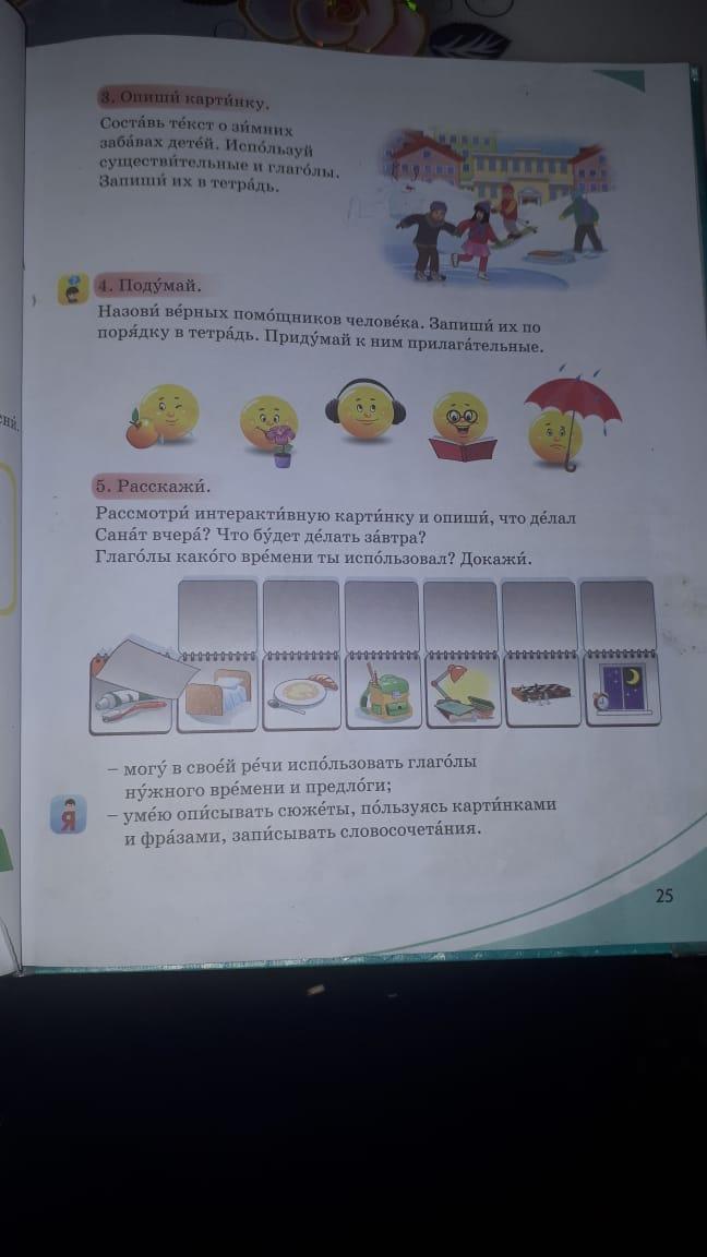 проснувшись санта почистил зубы , заправил кровать . после этого пошел завтракать ,и учиться . вечером он делал домашние задания и играл в шахматы после этого он лег спать .(как то так )