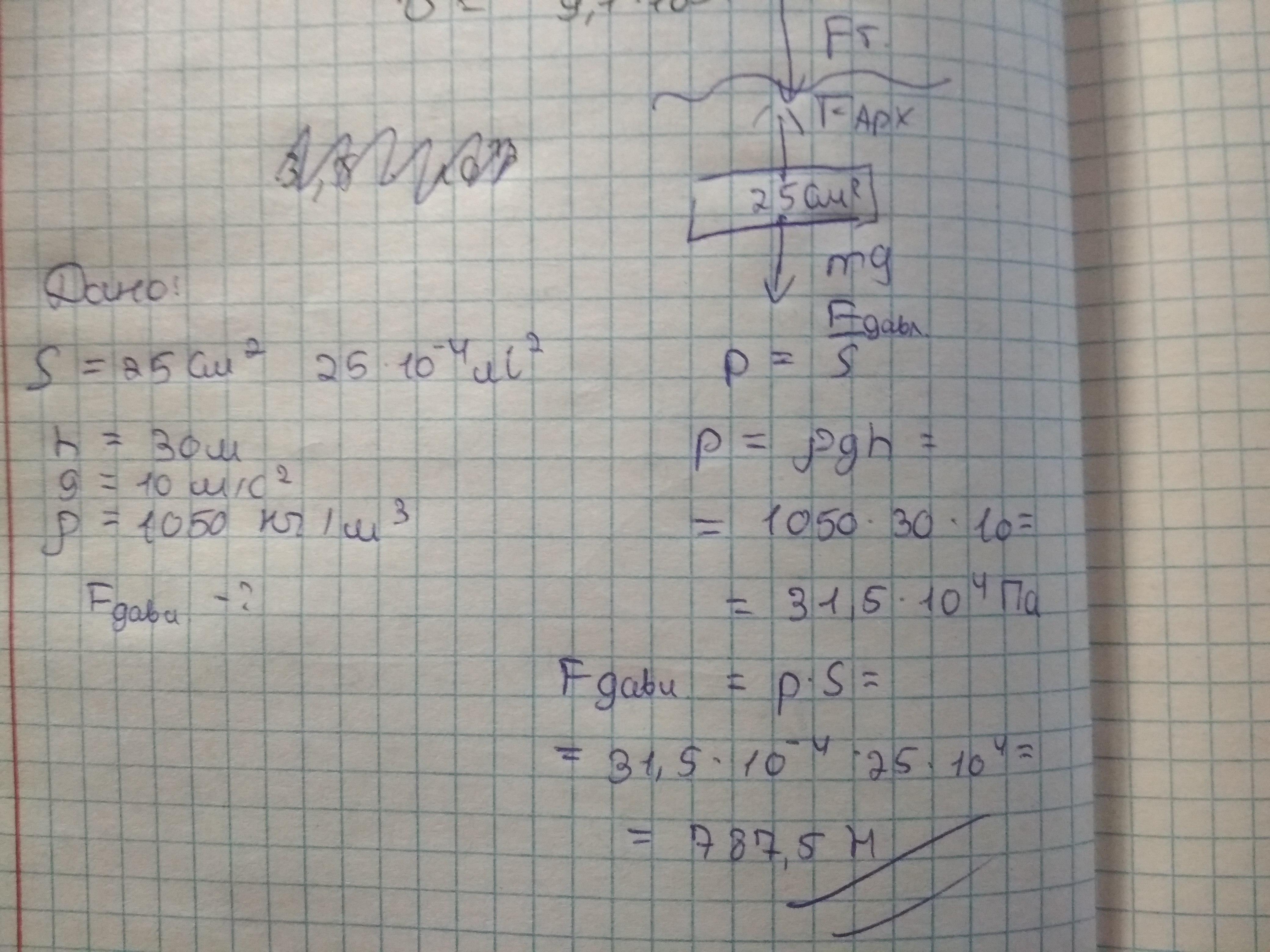 Какова сила давления на плоскую рыбу с площадью тела S = 25 см2? Рыба живет на глубине h = 30 м в морской воде, плотность которой можно считать равной ρ = 1050 кг/м3. Атмосферное давление в этот день нормальное.