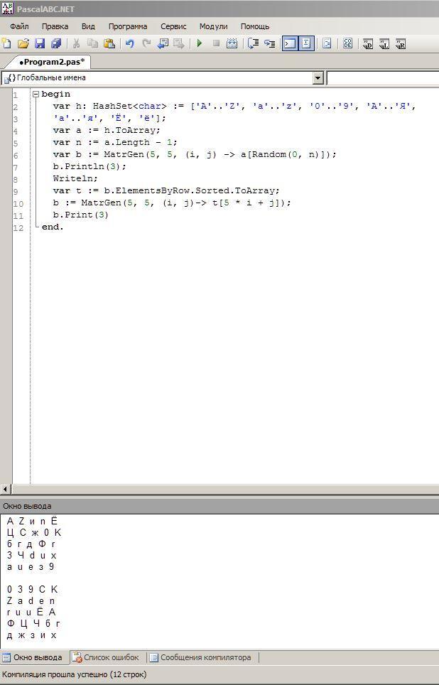 var b := MatrGen(5, 5, (i, j) -> a[Random(0, n)]);