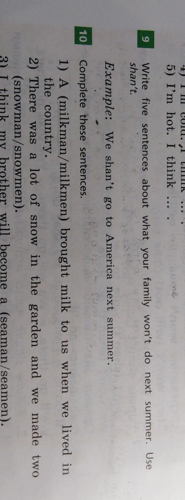 1.In this summer my family shan't go to France or England. 2. But we will go to Italy. 3. My family shan't stay in the camp. 4. My family will stay in hotel. 5. I think this travel shan't be horrible.