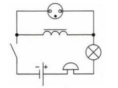 3) При размыкании ключа = звонок перестанет звенеть, лампа перестанет гореть, В катушке с сердечником возникает ток самоиндукции. Напряжение на клеммах катушки растет (напряжение выше чем при замкнутой цепи) и неоновая лампа вспыхивает.