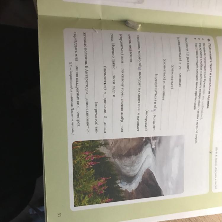 Высоко в горах снег скапливается в ращелинах, слёживается, сжимается и начинает превращаться в лёд. Когда его набирается слишком много, лёд выходит из своих ниш и начинает очень медленно спускаться вниз по склону горы, словно замерзшая река. Именно такие языки льда и называются ледниками. Ледники встречаются также около полюсов. В Антарктиде ледники занимают четырнадцать миллионов квадратных километров.