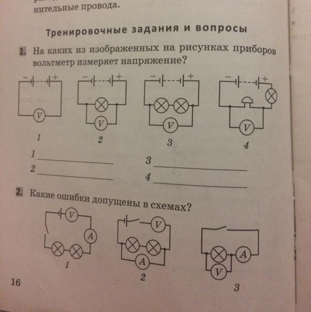 1. Вольтметр, измеряющий напряжение, всегда подключается параллельно элементу на котором оно измеряется. Следовательно на рисунках 1,2,3;вольтметр измеряет напряжение.