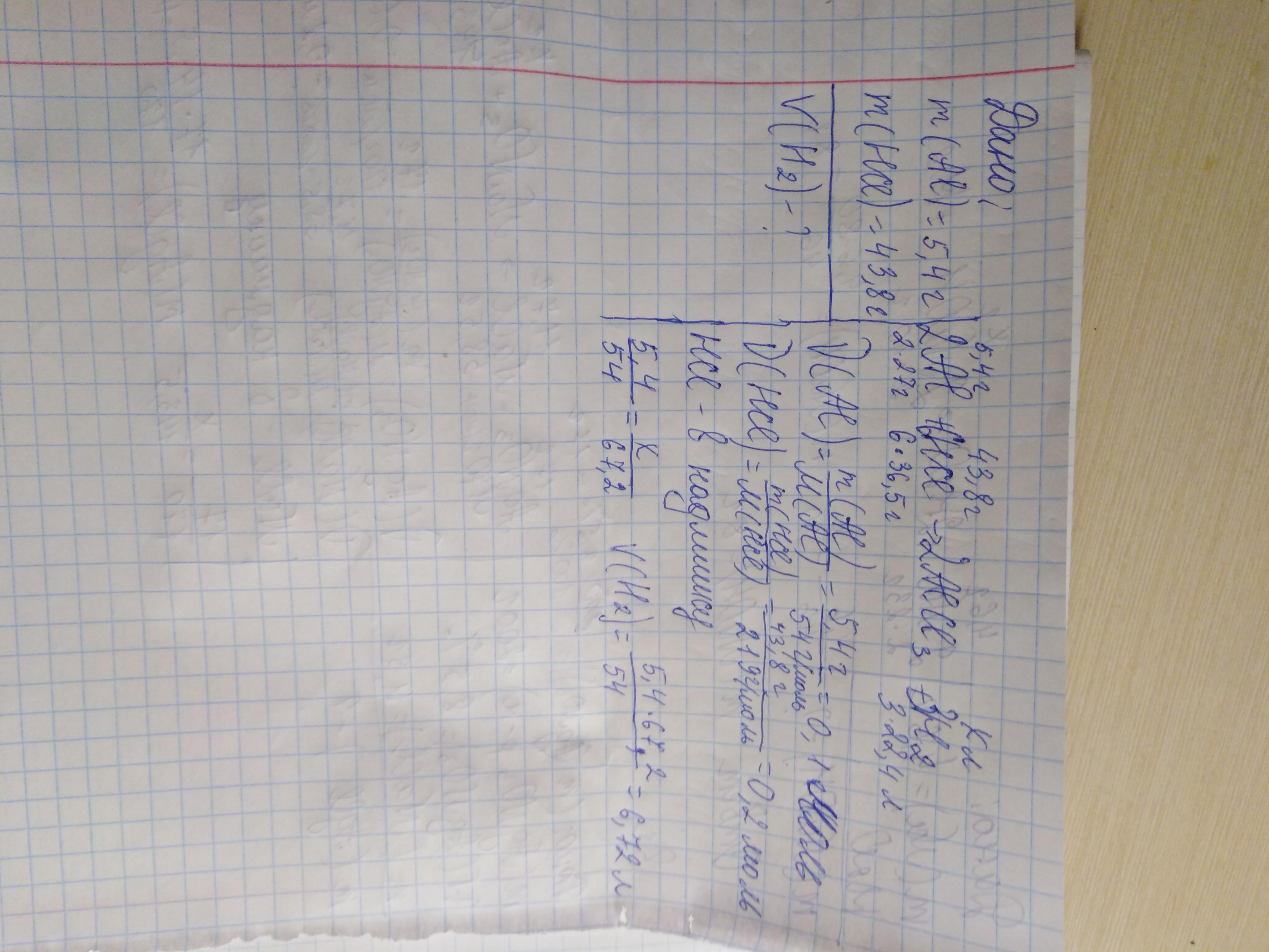 Какой объем водорода (н.у.) (л, до сотых) выделится при взаимодействии алюминия массой 5,4 г с раствором, в котором содержится 43,8 г хлороводорода?
