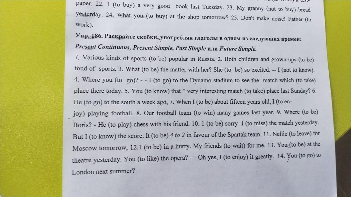 1. We goed on a tramp last Sunday. 2. Your brother will go to the country with us next Sunday? 3. Granny doesn't cooking dinner now. 4. We cooked our meals on a fire last summer. 5. My sister washes the dishes every morning. 6. When do you go to school? 7. What do you preparing for breakfast tomorrow? 8. Do you invited your cousin to stay with you next summer? 9. How did you help your sister last summer? 10. I'll send an email to a friend tomorrow. 11. Every morning on the way to school i meeting my friends. 12. My friend goes to the library every Wednesday. 13. He didn't go to the country yesterday. 14. Why did you go to the store yesterday? 15. We are going to grow tomatoes next summer. 16. What are you doing now? 17. He's sleeping now. 18. Where did your dad work last year? 19. You're going to the South next summer! 20. He didn't watch TV yesterday. 21. Yesterday we wrote a test-paper 22. I bought a very good book last Tuesday. 23. My Granny didn't buy bread yesterday. 24. What will you buy at the shop tomorrow? 25. Don't make noise! Father is working.