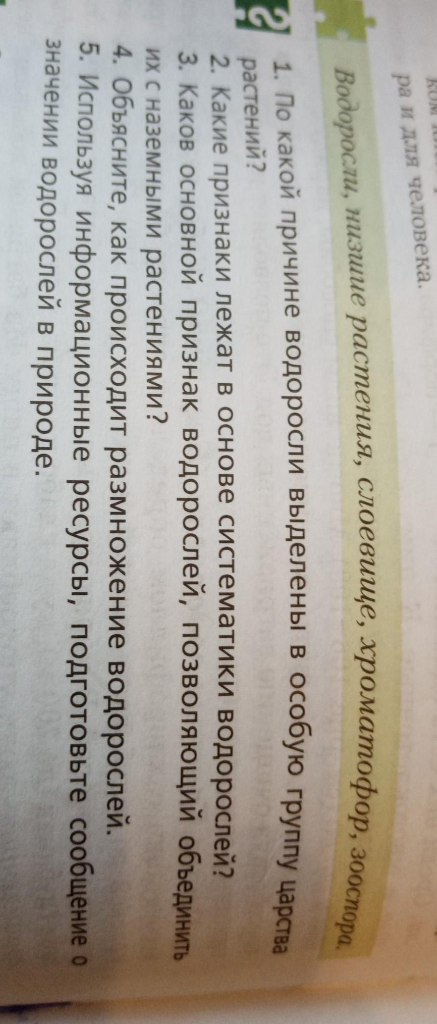 3 то что водоросли бывают многоклеточные и одноклеточные 4Водоросли размножаются вегетативно. Это такой способ размножения, при котором взрослая особь делится надвое или, например, происходит отделение почки от материнского тела. Затем вновь образованные клетки делятся на две и четыре клетки, из которых впоследствии вырастает взрослая водоросль. Бесполое размножение. Такой вид, при котором внутри клетки водоросли происходит деление протопласта, с последующим его выходом наружу и отделением от материнской клетки. Водоросли размножаются спорами, которые образуются в специальных органах - спорангиях. Половое размножение. Заключается в слиянии двух клеток, гамет, в результате чего появляется зигота, которая впоследствии вырастает в новую особь или даёт зооспоры. Причём зиготы различных водорослей после своего образования ведут себя по-разному. У одних они впадают в период покоя, который может длиться до нескольких месяцев. А другие же прорастают сразу в новый слой или слоевища. 5 посмотри в интернете