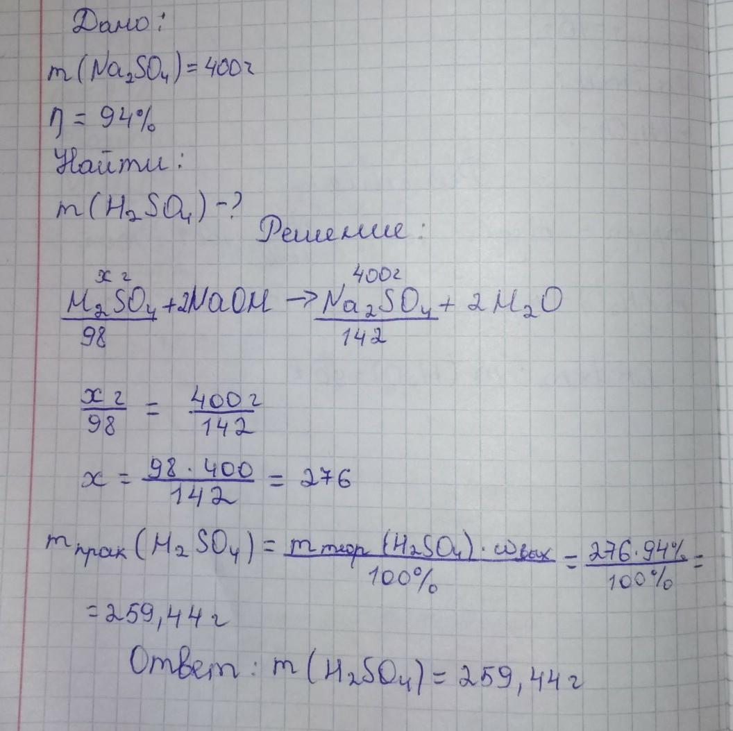 при нейтрализации серной кислоты гидроксидом натрия выделилось 400 г сульфата натрия, что составляет 94 процента от теоретически возможного выхода. Найти массу серной кислоты