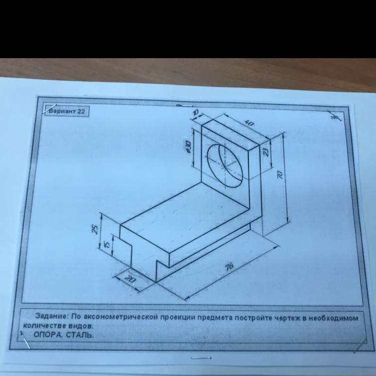 Задание:по аксонометрической проекции предмета постройте чертёж в необходимом количестве видов.ОПОРА СТАЛЬ .Помогите пожалуйста