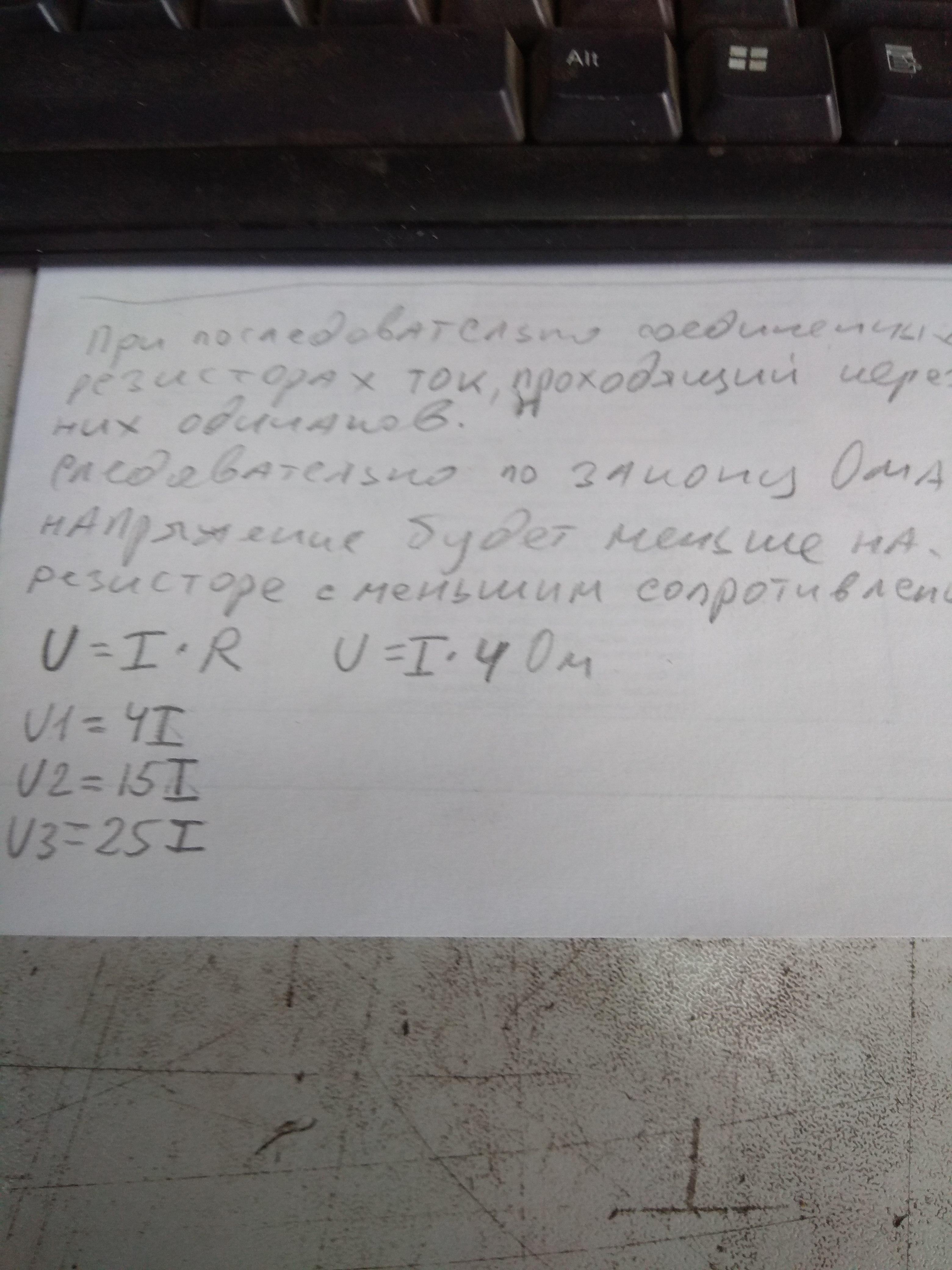 Даны три последовательно подключённых резистора, у которых сопротивления соответственно равны 4, 15 и 25 Ом. На каком резисторе напряжение будет меньше?