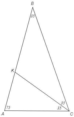 В треугольнике АВС угол А равен 75, угол С равен 70, СК биссектриса треугольника АВС. СК равно 12см. Найдите длину отрезка КВ.