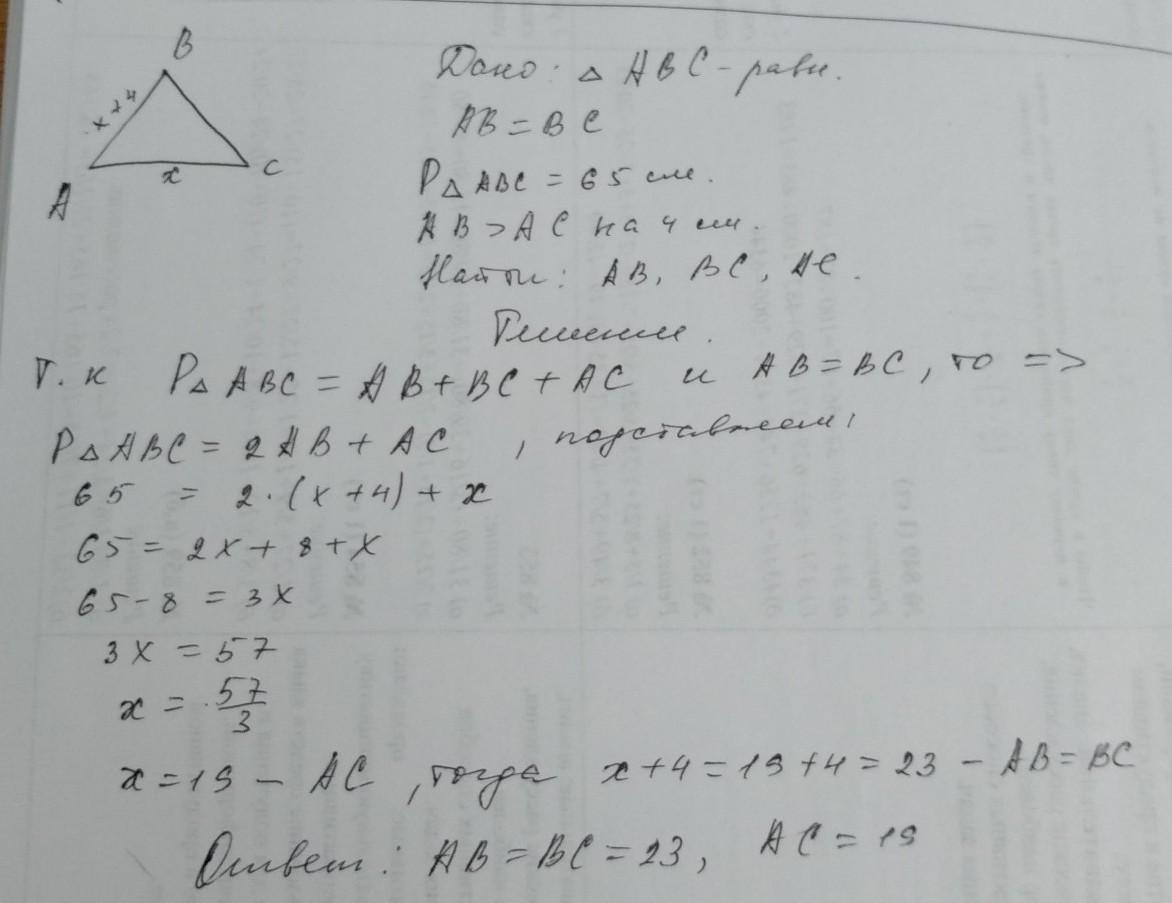 Значит основание АС=19см,тогда боковые стороны АВ=ВС=19+4=23см