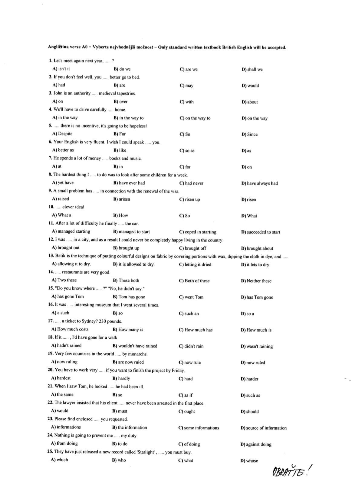 Anglictina verze A0 - Vyberte nejvhodnější možnost - Only standard written textbook British English will be accepted.