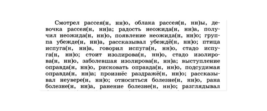 Смотрел *рассеянно*, облака *рассеянны*, девочка *рассеянна*, радость неожиданна, получил *неожиданно*, появление неожиданно, группа *убеждена*, рассказывал *убеждённо*, птица *испугана*, говорил *испуганно*, стоит *изолированна*, стадо *изолировано*, заболевшая *изолирована*, выступление *оправданно*, рисковать *оправдано*,подсудимая *оправдана*, произнёс *раздраженно*, рассказывал *неуверенно*, относиться *болезненно*,рана *болезненна*, ранение *болезненно*