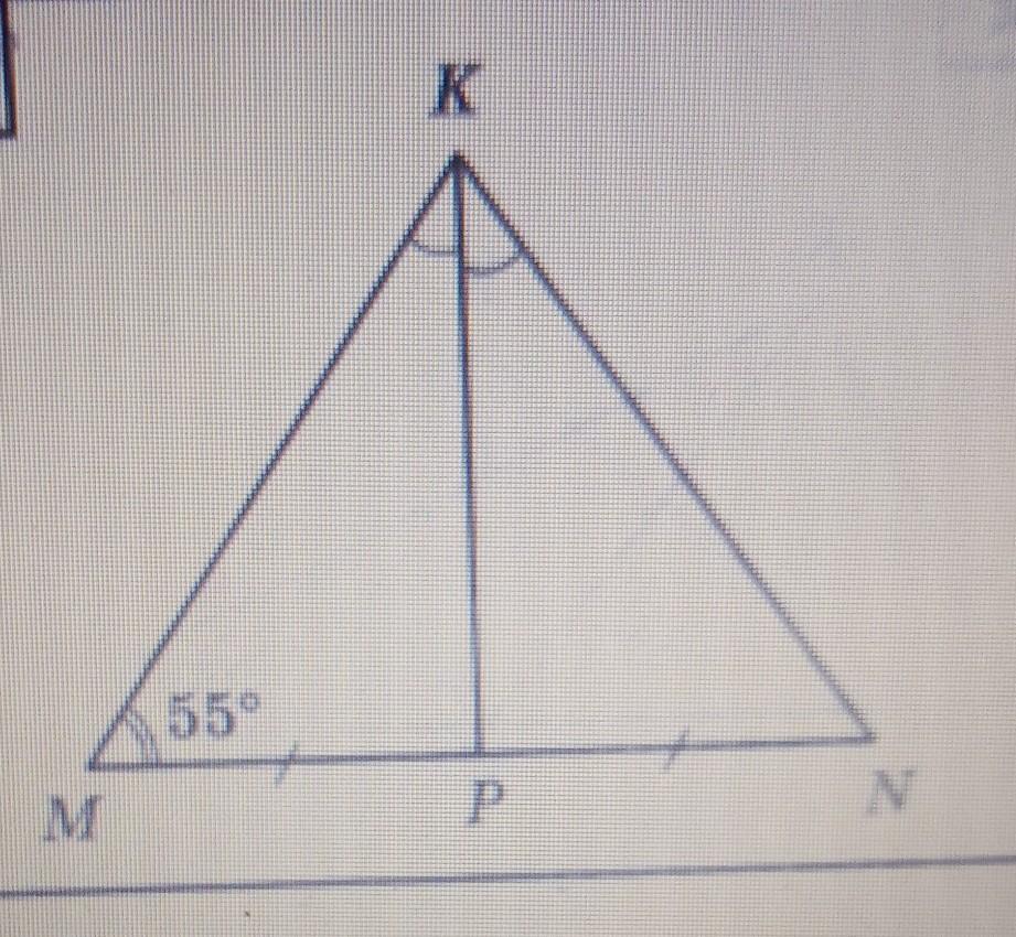 По чертежу известно, что КР - биссектриса ( < MKP = < PKN ), также известно, что КР - медиана ( МР = РN ). Отсюда следует, что этот треугольник равнобедренный, и КР- высота, а значит < KPM=<KPN=90 градусов. Раз треугольник равнобедренный, то углы при основании равны, значит < KMP = <KNP = 55 градусов. Итак далее, <MKN = 180-55-55=70 градусов ( по теореме о сумме углов в треугольнике ). <MKP=<PKN= 70 : 2 = 35 градусов ( так как КР - биссектриса )