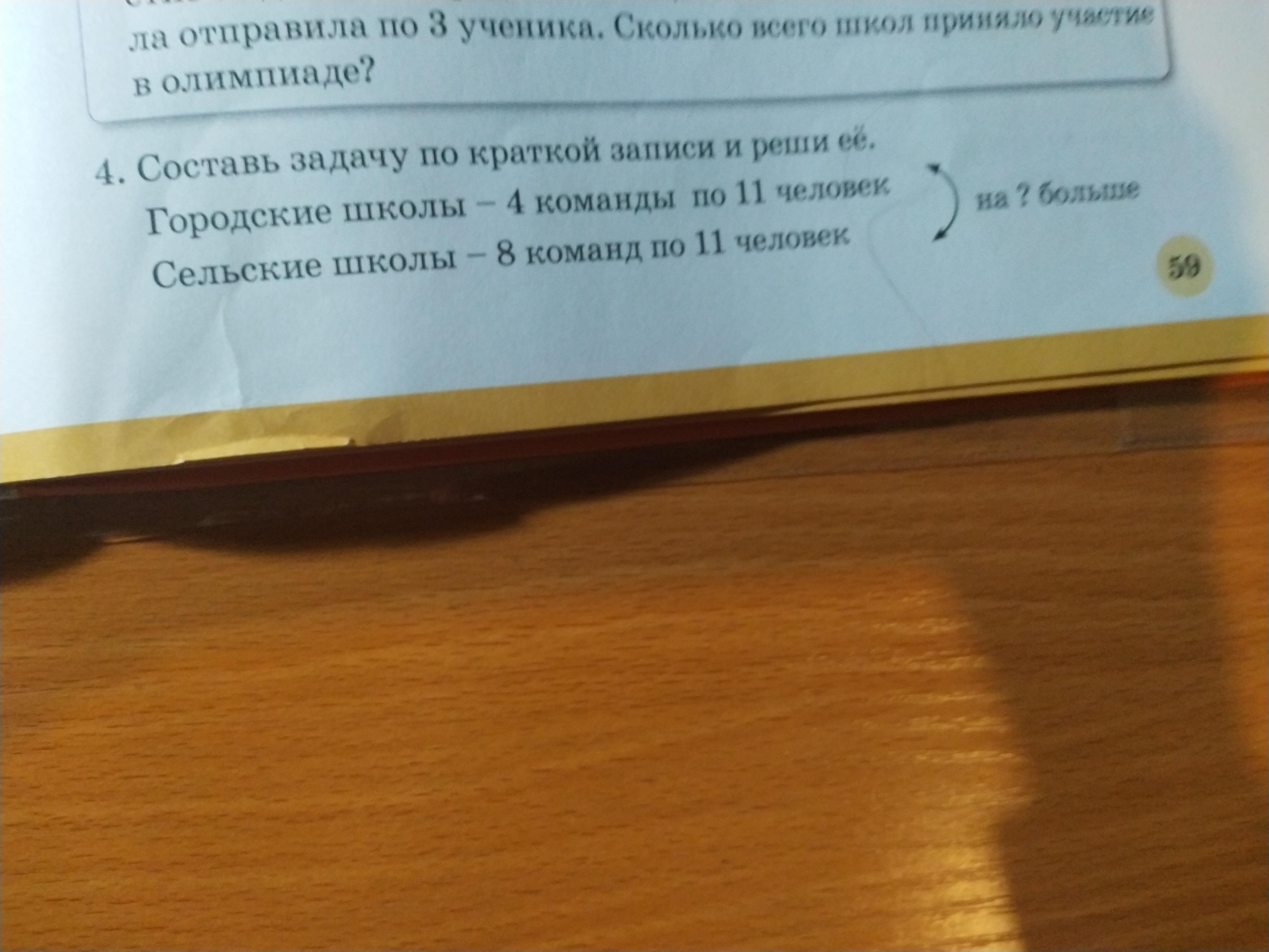 от городских школ пошли на соревнования 4 команды по 11 человек а в селе 8 команд по 11 человек. На сколько больше учеников из сельских школ приняли участие в соревнованиях?