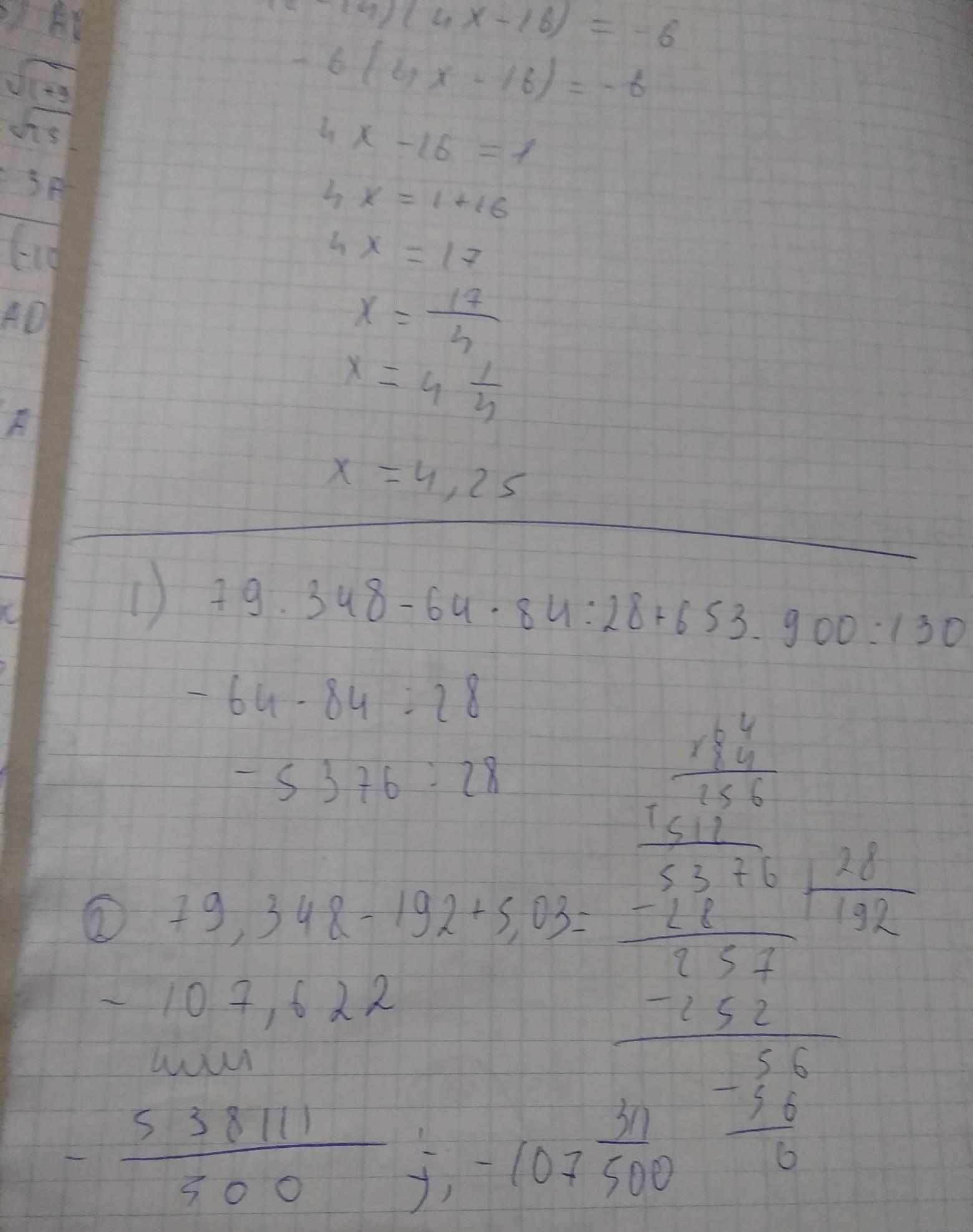 #817 выполни действия 1 пример: 79.348 - 64 * 84 : 28 + 653.900 : 130=?