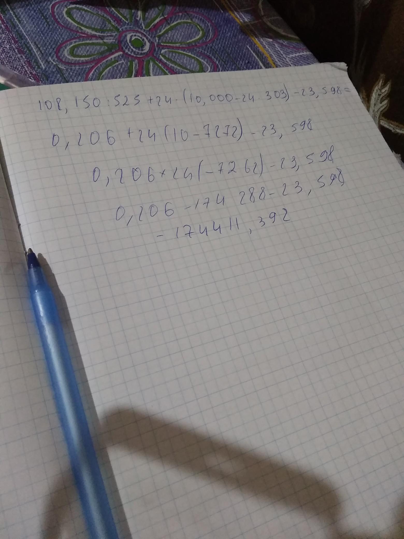 2 пример: 108.150 : 525 + 24 * (10.000 - 24 * 303) -23.598=?