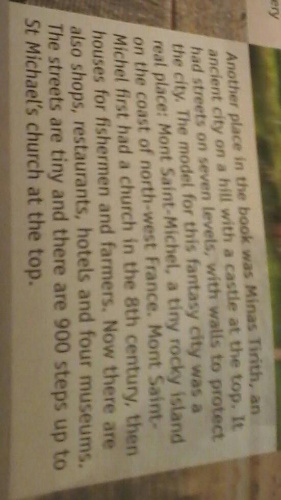 Другим местом в книге был Минас-Тирит, древний город на холме с замком на вершине. Улицы располагались на семи уровнях, а стены защищали город. Образцом для этого фантастического города послужило реальное место: Мон-Сен-Мишель, крошечный скалистый остров на побережье Северо-Западной Франции. На Мон-Сен-Мишель сначала была церковь в 8 веке, затем дома для рыбаков и фермеров. Теперь здесь также есть магазины, рестораны, отели и четыре музея. Улицы крошечные, и есть 900 ступенек до церкви Святого Мишеля на вершине