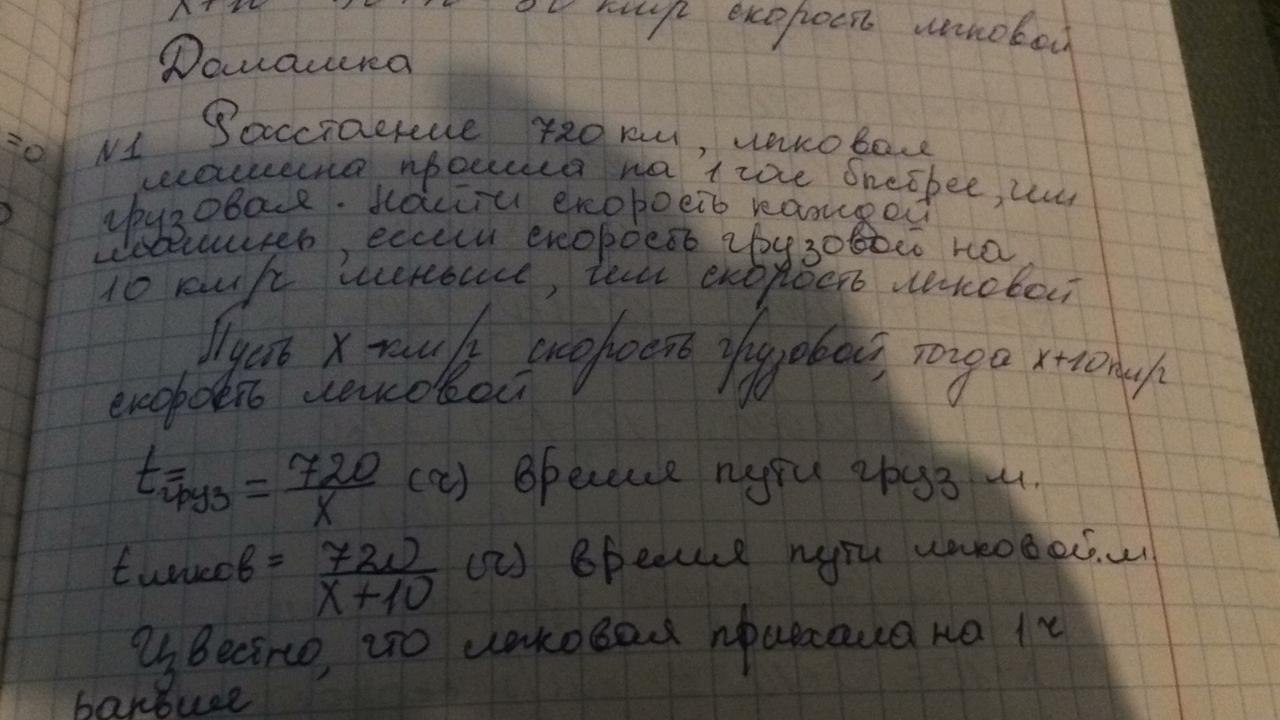 Пусть х км/ч - скорость грузового автомобиля, тогда 720 км он проедет за 720 : х (часов). х+10 км/ч - скорость легкового, тогда это расстояние он проедет за 720 : (х+10) (часов). Уравнение
