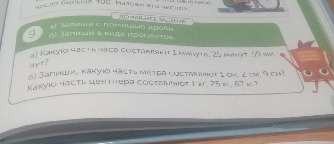 Там а) запиши с помощью дроби. б) с помощью процента. Получается а) 1/60,25/60, и59/60? И б) 99% от часа, 98%от часа, 91% от часа, и 99% от центнера, 75% от центнера, 13% от центнера? Правильно?