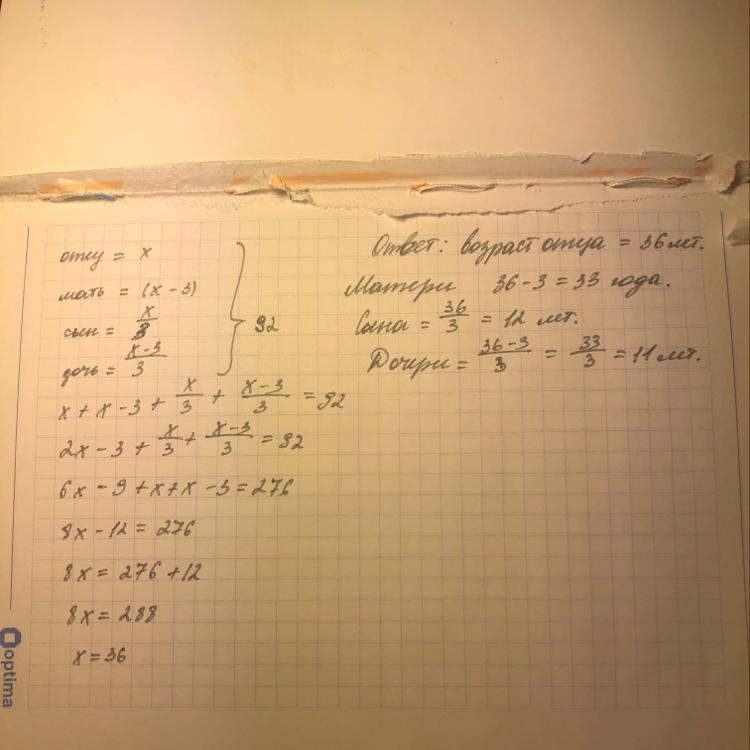 Возраст отца x лет, мама на 3 года младше отца. Сын младше отца в 3 раза, дочь младше матери в 3 раза. Сколько лет каждому, если общий возраст отца, мамы, сына и дочери