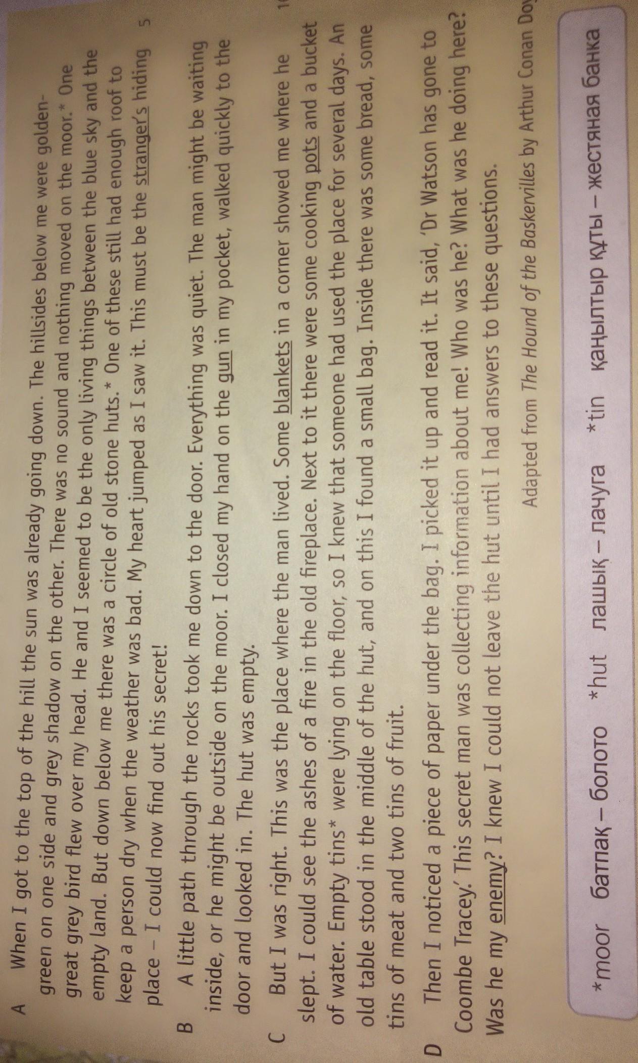 Когда я добрался до вершины холма, солнце уже рассветало. Склоны холмов покрывают зеленую, с одной стороны, серую тень с другой. Не было никакого звука, и ничего не двигалось на мысе, большая серая птица пролетела над моей головой. Он и я, казалось, были единственными живыми существами между голубым небом и пустой землей. Но подо мной был круг старых каменных хижин. У одного из них все еще было достаточно крыши, чтобы держать человека сухим, когда погода была плохой, Мое сердце подпрыгнуло, когда я увидел это. Это должно быть странное место, где я мог теперь узнать его секрет! Небольшая тропинка через скалы привела меня к двери. Все было тихо. Человек может быть ватманом внутри, может быть, он снаружи на болоте. Я закрыл руку на пистолете в кармане, быстро подошел к двери и заглянул внутрь. Хижина была пуста. Но я был прав. Это было место, где мужчина болтался. Некоторые одеяла в углу показали мне, где он шагнул. Я мог видеть пепел огня в старом камине. Рядом с ним стояли кастрюли и ведро с водой. На полу валялись пустые кубики, поэтому я знал, что кто-то использовал это место в течение нескольких дней. Посередине хижины стоял старый стол, и на этом я нашел небольшую сумку. Внутри есть немного хлеба, банки соевого мяса и две банки фруктов. Затем я заметил лист бумаги под сумкой. Я взял это и прочитал это. В ней говорилось, что доктор Ватсон отправился к Кумб Трейси. Этот секретный человек собирал информацию обо мне! Кто был он? что он здесь делал? Был ли он моим врагом? Я понял, что не смогу покинуть хижину, пока не получу ответы на эти вопросы, адаптированные из «Собаки Баскрвилей» Армуном Кананом.