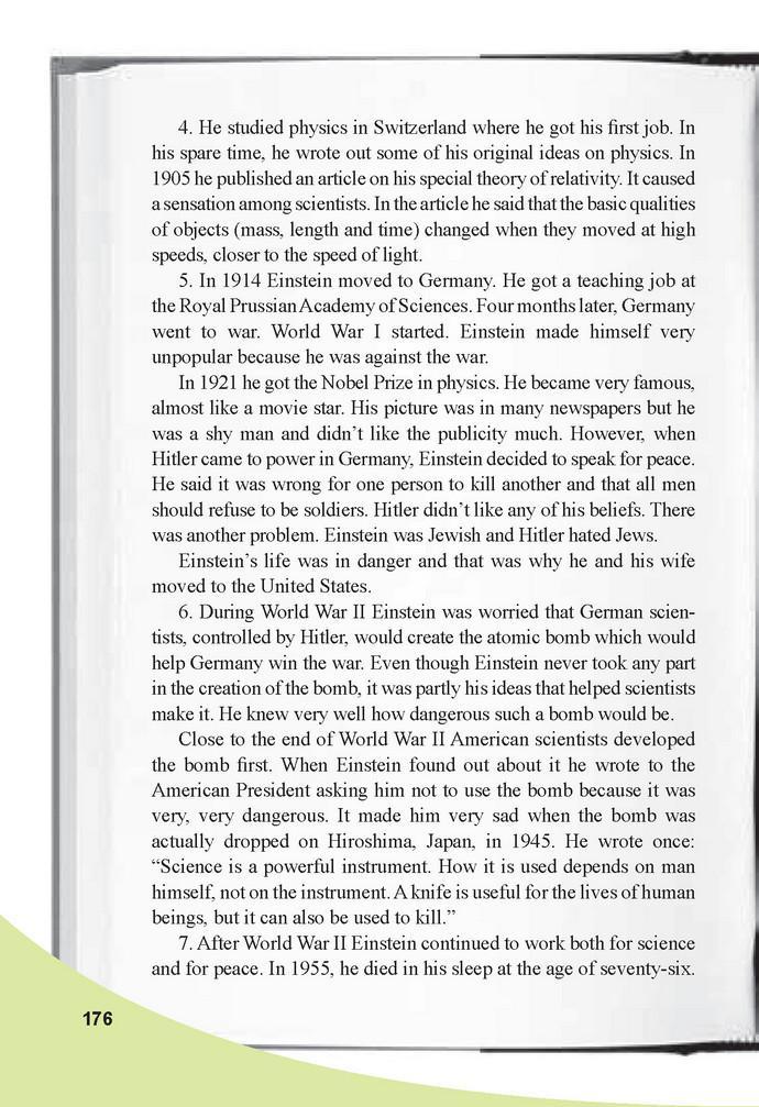 Если кто-то называет тебя Эйнштейном, считай это комплиментом. Это означает, что тебя сравнивают с одним из величайших умов двадцатого века. На самом деле, много людей верит, что он был самым образованным человеком, которые когда-либо появлялись на свет. Он имел IQ (коэффициент образованности) гения. Альберт Эйнштейн был не только гением, но и мягким человеком (джентльменом). Он любил музыку, детей и плавание на яхте. Он носил ботинки без носков и редко имел особую прическу. Его называют гением, потому что многие его научные открытия намного опередили время. Он запомнился мягким (добрым) человеком, потому что он верил, что все нации смогут жить без войны. Он всегда говорил о мире.