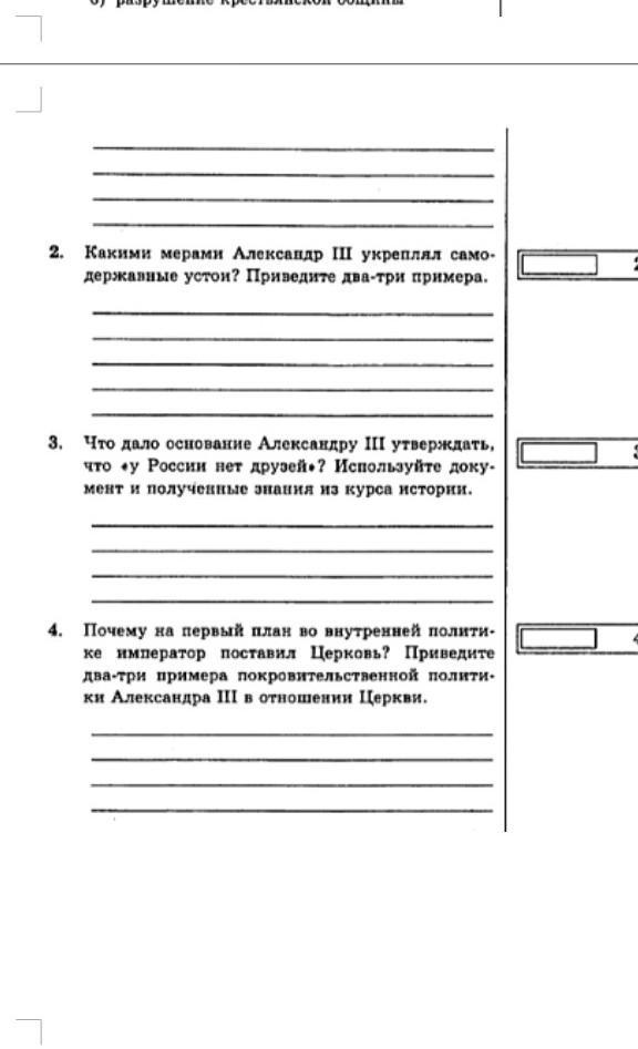 3) Александр 3 укреплял самодержавие опираясь на религию. Создал кучу мифов о Божественном происхождении его власти и о том, что покушения на царя является кощунственным и еретическим преступлением. Он также привлек к себе любовь дворян создовая для них выгодные экономические и социальные условия для жизни. В 1885 году Александр 3 открыл Дворянский банк дававший суды на льготных условиях под залог поместий. Александр 3 опасался, что в условиях падения цен на зерно многие помещики разорятся, дворянство погибнет и самодержавию потеряет свою политическую поддержку, которое исходило от дворян.