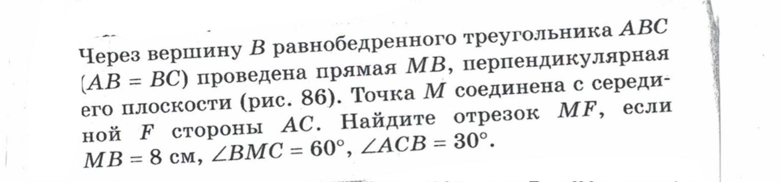 1) Проекция искомого отрезка MF на плоскость треугольника АВС это высота BF этого треугольника (он равнобедренный, углы при основании равны).