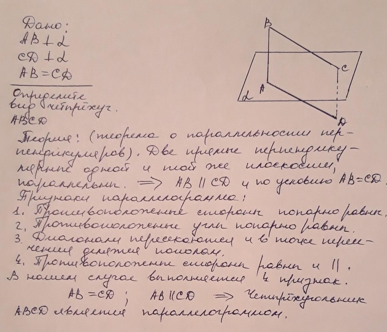 Дано ab перпендикулярно альфа cd перпендикулярно альфа ab=cd определить вид четырехугольника abcd