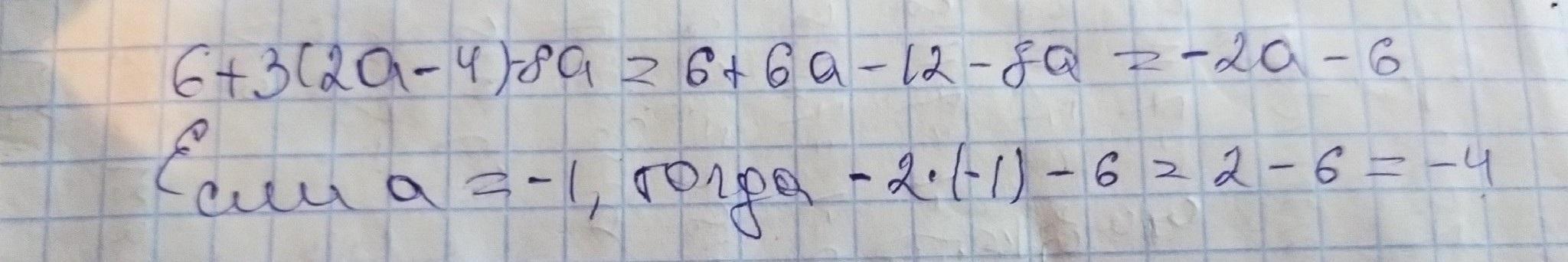 6+3(2а-4)-8а= 6+6a-12-8a= -2a-6, если a=-1, то