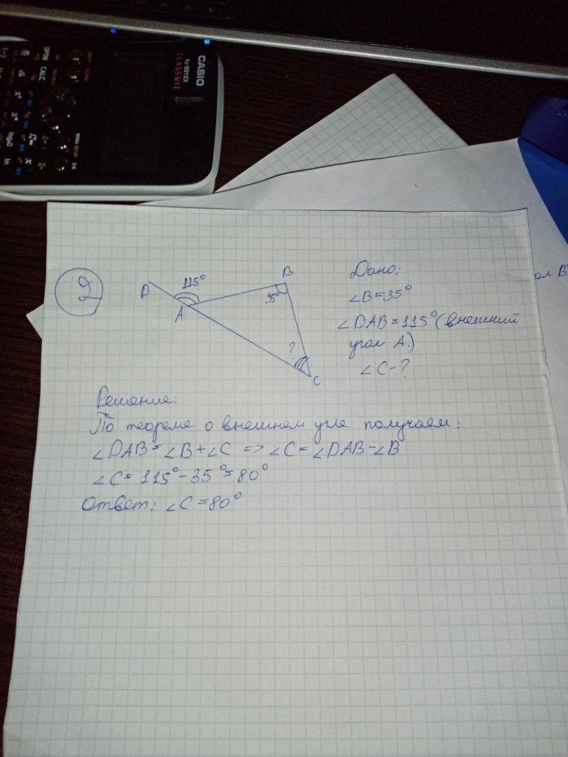 Задача 2. В треугольнике ABC, угол B = 35 градусов. внешний угол при вершине А = 115 градусов. Найти угол C