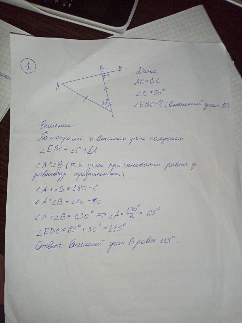 Задача 1. В треугольнике ABC, AC = BC, угол C = 50 градусов. Найти внешний угол при вершине угла B