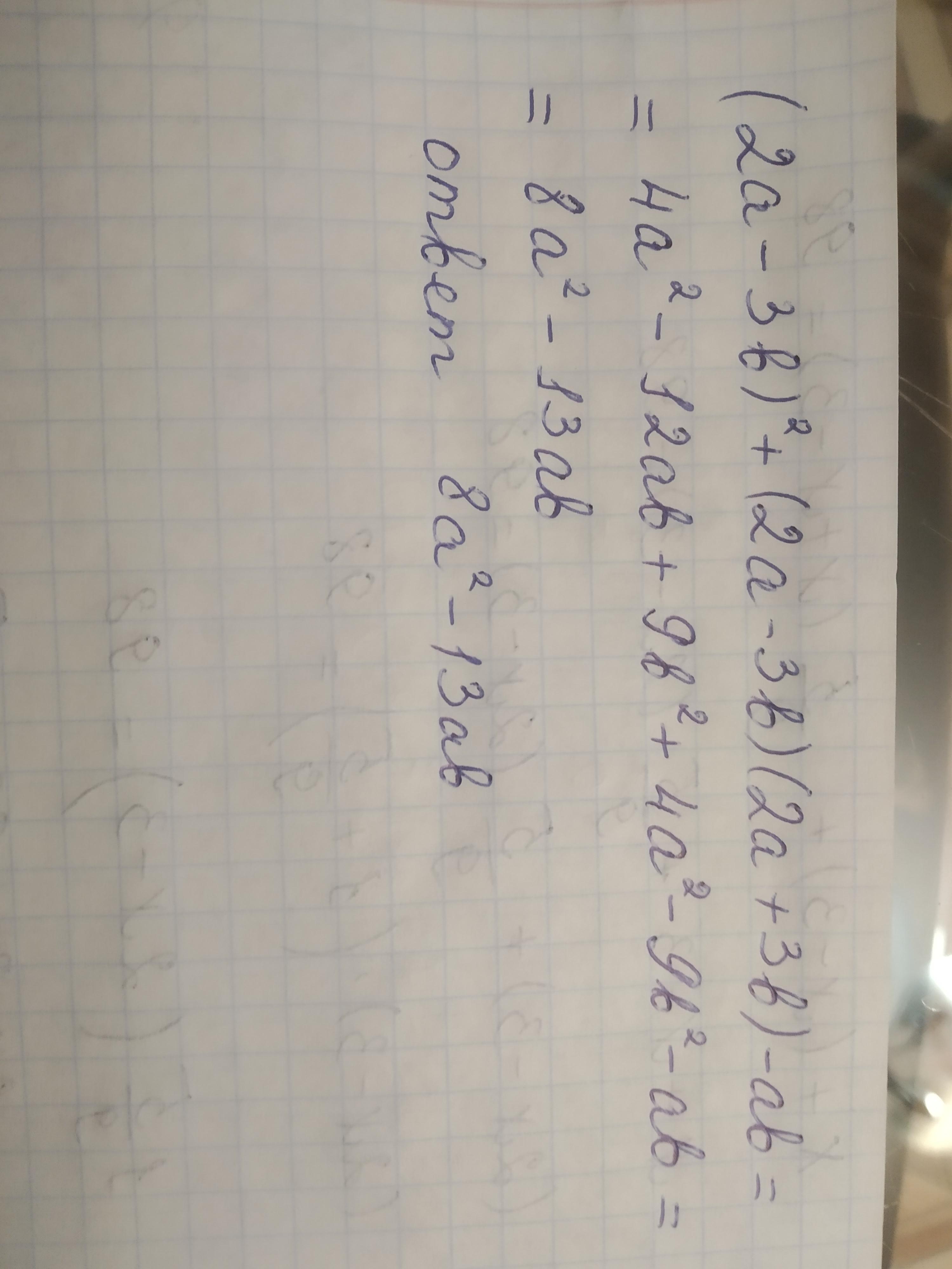 (2a-3b)^2 + (2a-3b)(2a+3b) - ab = 4а^2 - 12ab + 9b^2 + 4a^2 - 9b^2 - ab = 8a^2 - 13ab = a (8a - 13b)