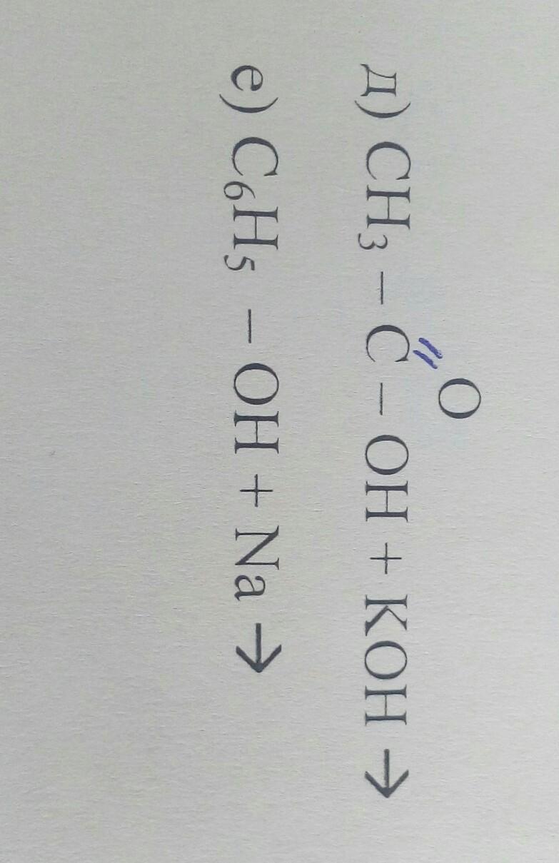 Д) CH3-C(=O)-OH (карбоновая кислота) + KOH = CH3-C(=O)-OK + H2O