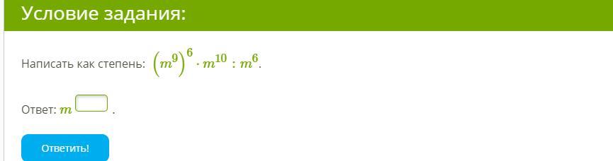 (m^9)^6*m^{10}:m^6=m^{9*6}*m^{10}:m^6=m^{54}*m^{10}:m^6=\\=m^{54+10-6}=m^{58}