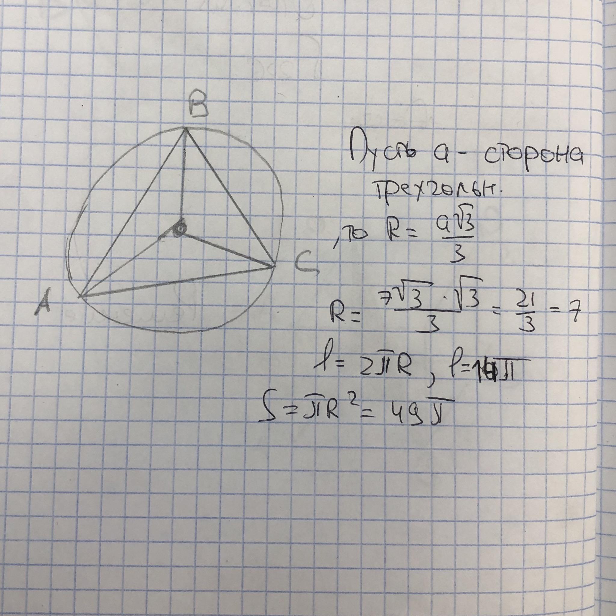 Найдите площадь круга и длину ограничивающей его окружности если сторона правильного треугольника вписанного в него равна 7корень3 см