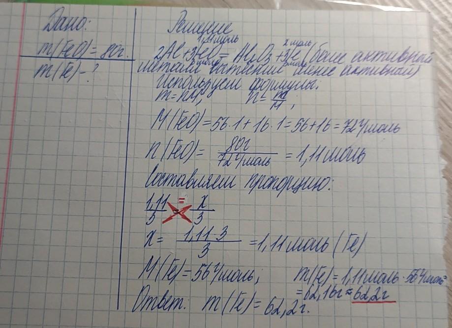 Найти массу железа, полученного при взаимодействии алюминия с 80г оксида железа (II)